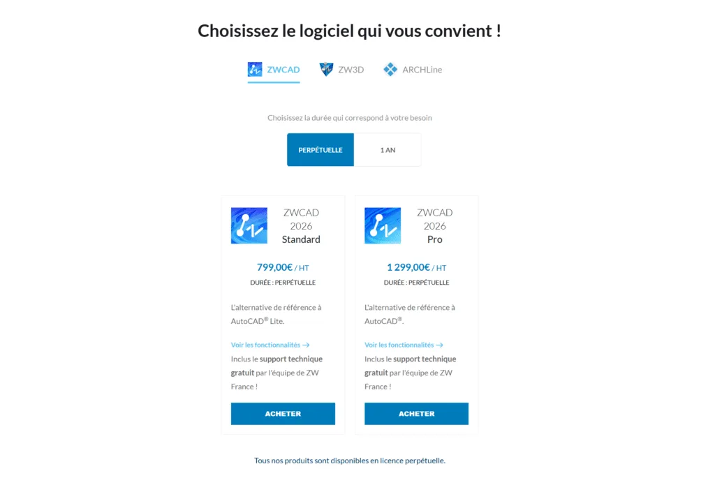 ZWCAD quant à lui, à l’instar d’AutoCAD, est proposé en 2 versions à licence perpétuelle : la version Standard (équivalant à AutoCAD LT) et la version Pro (équivalant à AutoCAD). Elles sont respectivement proposées 799€ HT et 1299 € HT (licence perpétuelle, je rappelle).